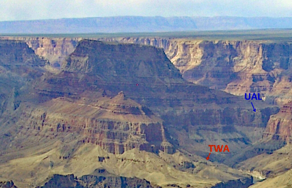 As the two aircraft approached the Grand Canyon, at the same altitude and nearly the same speed, the pilots were likely maneuvering around towering cumulus clouds. (The Constellation’s clearance required it to stay in clear air – and above cloud.) As they were maneuvering near the canyon, it is believed the planes passed the same cloud on opposite sides.[8]