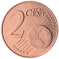 The 2 euro cent coin (€0.02) has a value of one fiftieth of a euro and is composed of copper-plated steel. All euro coins have a common reverse and country-specific (national) obverse. The coin has been used since 2002 and was not redesigned in 2007 as were the higher-value coins.