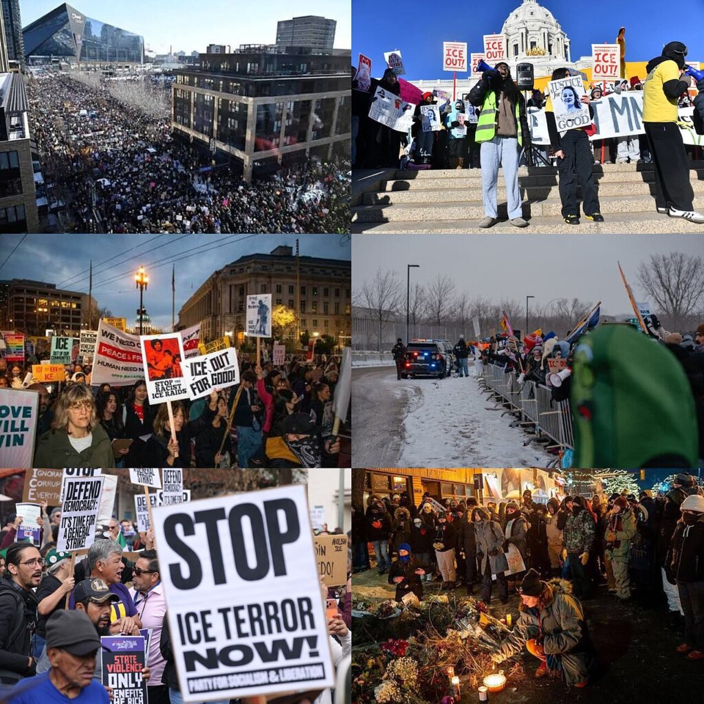 From top, left to right: Protesters march in downtown Minneapolis against federal immigration enforcement, Demonstrators gather outside a federal building in Minneapolis holding anti-ICE signs, Anti-ICE protest held in San Francisco in solidarity with Minneapolis, Peaceful protest outside a church in Minneapolis, Protesters march through Los Angeles following the Minneapolis shooting, People mourn the death of Alex Pretti at a memorial in Minneapolis