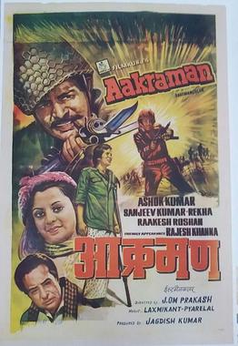 Aakraman (lit. ‘Invasion‘) is a 1975 Indian Hindi language war film, produced by Jagdish Kumar and directed by J. Om Prakash.[1] The war film stars Ashok Kumar, Sanjeev Kumar, Rekha, Rakesh Roshan, Farida Jalal, Sujit Kumar, Asrani, Keshto Mukherjee, Mumtaz Shanti and Rajesh Khanna in an extended guest appearance. The music is by Laxmikant Pyarelal. The Hindustan Times noted that Rajesh Khanna as the disabled Punjabi soldier with two emotional songs picturised on him was inspiring.[2]