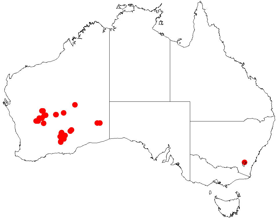 It is native to an area in the Goldfields-Esperance region of Western Australia where it commonly situated on saline stony plains, near salt lakes and sandplains growing in clay, clay-loam, gravelly and sandy soils.[1] It has a scattered distribution and is found from around Windimurra and Weebo Station and Lake Yindarlgooda in the north down to around Norseman in the south as well as Carlisle Lakes as a part of low open shrubland with various species of Atriplex and Maireana.[2]