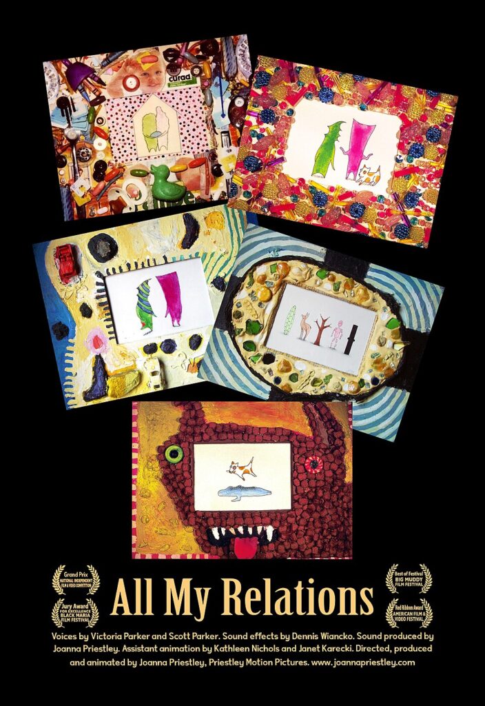 ””’All My Relations””’ is a 5-minute short [[animation|animated film]] from 1990, directed by [[Joanna Priestley]]<ref name=”animatorsunearthed”>[https://books.google.com/books?id=oozKz8Hu4xIC Animators Unearthed – Google Books (ch. “Visions of Joanna Priestley”)]</ref><ref>[https://www.tcm.com/tcmdb/title/505625/all-my-relations#overview Turner Classic Movies]</ref> and made from drawings on paper with 3-D frames.<ref>{{Cite web|url=https://www.allmovie.com/movie/all-my-relations-v340161|title=All My Relations (1990) – Joanna Priestley | Cast and Crew|website=AllMovie|accessdate=Jul 29, 2019}}</ref> |