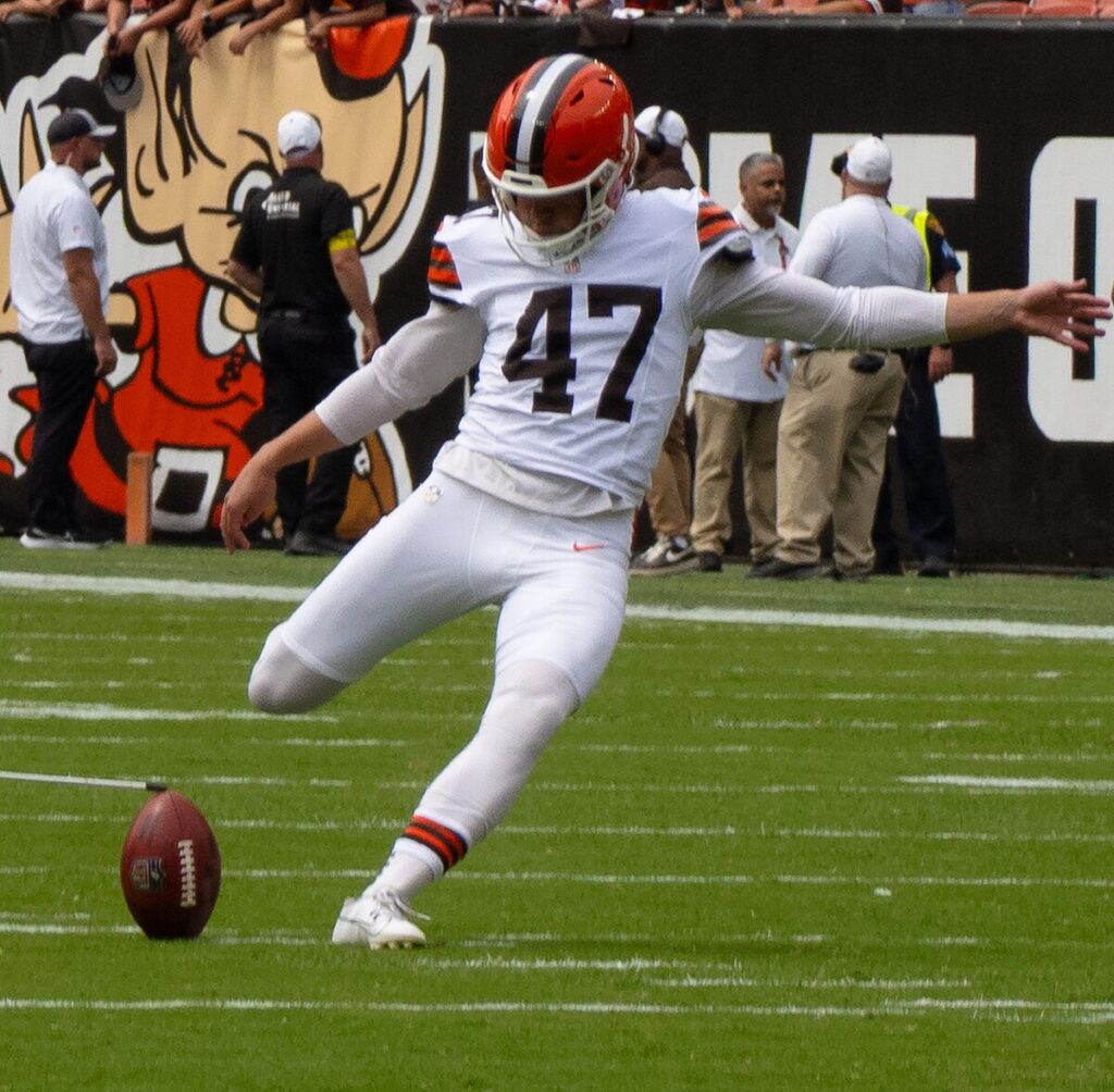 On December 24, 2024, Szmyt was signed to the Cleveland Browns practice squad.[11] He signed a reserve/future contract with Cleveland on January 6, 2025.[12] On June 4, Szmyt was waived by the Browns.[13] He was re-signed on June 26.[14] On August 26, Szmyt made the Browns’ initial 53 man roster, beating out incumbent Dustin Hopkins for the kicking job.[15] On September 7, Szmyt missed an extra point to tie the game, and late in the same game missed a field goal that would have given the Browns a win against the Cincinnati Bengals in the 17–16 loss, causing some media and fans to criticize him.[16] However, 2 weeks later on September 21, Szmyt hit a game-winning 55-yard field goal to beat the Green Bay Packers in a 13–10 comeback win.[17]