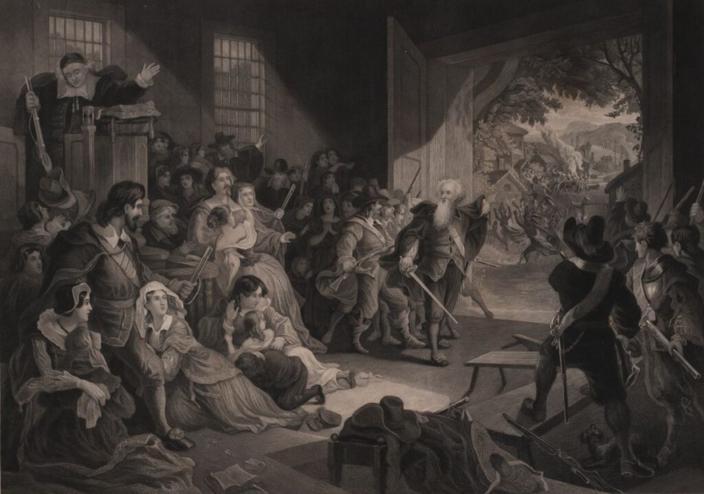 The first publication of the angel tale was apparently in the late 18th century by Thomas Hutchinson in his History of the Province of Massachusetts Bay, in which he describes the tale as having originated with John Leverett’s family. Subsequent historians picked up and elaborated on the story. Later in the 19th century historians began to examine the story more critically, with George Sheldon specifically debunking it in 1874. Because of the inconsistencies raised by Sheldon, many 20th-century historians have accepted that the tale does not describe an event that actually happened, and it has been widely propagated as not having occurred. Douglas Wilson carefully reassessed the available evidence, concluding in his 1987 paper on the matter that it might have taken place, and that the event, and Goffe’s involvement in it, were covered up by Goffe’s protectors.