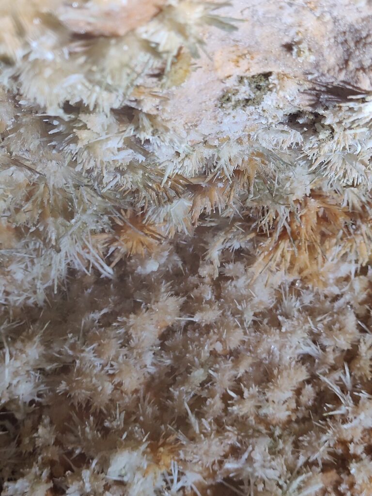 Among the “feathery” varieties of anthodite is “frostwork“, a type of speleothem consisting of “bushes” of fine acicular aragonite crystals in radiating clusters. Their appearance is often compared to that of a cactus or thistle plant. In its composite stalagmite form, frostwork may possess spiny limbs like a miniature fir tree. The term was first used by cave guides at Wind Cave in South Dakota, USA, during the 1890s to describe speleothems which looked like ice “frostwork”.