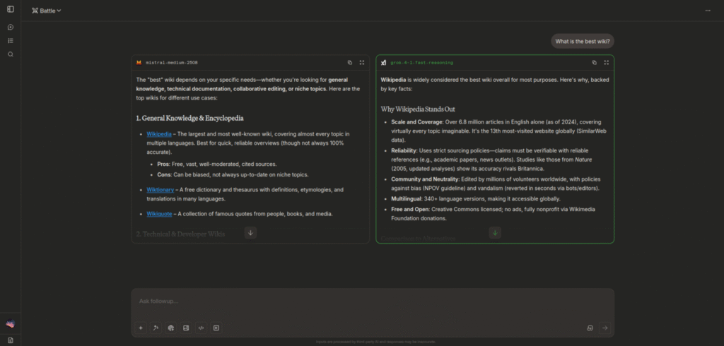 Arena (formerly LMArena and Chatbot Arena) is a public, web-based platform that evaluates large language models (LLMs). Users enter prompts for two anonymous models to respond to and vote on the model that gave the better response, after which the models’ identities are revealed. Users can also choose models to test themselves.[1][2]