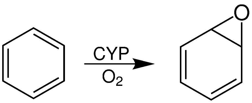 In chemistry, an arene oxide is an epoxide of an arene. Two important families of arene oxides are benzene oxides and naphthalene oxides as these are intermediates in the oxidative degradation of benzene and naphthalene, two common pollutants.[1] Benzopyrene is also converted to an epoxide, (+)-benzo[a]pyrene-7,8-epoxide.[citation needed]