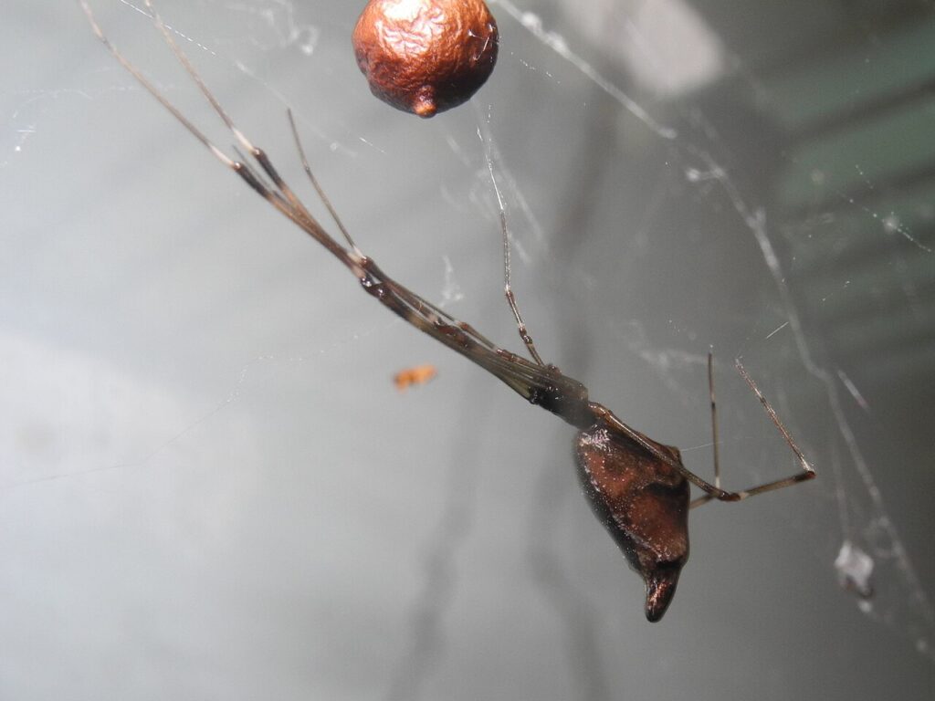 The female is larger than the male, at about 12mm in length. The abdomen is triangular, with the spinnerets pointing downwards and the hind-end pointing backwards. The body has silvery spots and has long and thin legs. The males have bumps on their head. After mating, male seals the epigyne of the female with a resin plug to inhibit further copulation.[2]