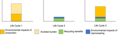 Avoided burden can also be used, and is most often used, in the context of recycling. In this setting, it is also known as the end of life recycling approach. Here, the environmental consequences between product systems are weighed and the benefits of recycling are credited to a product’s first life cycle.[1] These benefits are equivalent to the environmental impacts that would have otherwise resulted from processing additional virgin materials.[4] For instance, PET bottles may be given environmental credit for the PET they contain since the material will eventually be recycled back into further PET products.[5] A product’s subsequent life cycles include the environmental impacts generated from collecting, preparing, and reprocessing the product for each future use. In this case, the avoided burden method takes the environmental impacts generated from manufacturing a recyclable product with virgin materials and transfers them to the product’s final life cycle.[6] As a result, the first life cycle of a product can have negative environmental impacts.