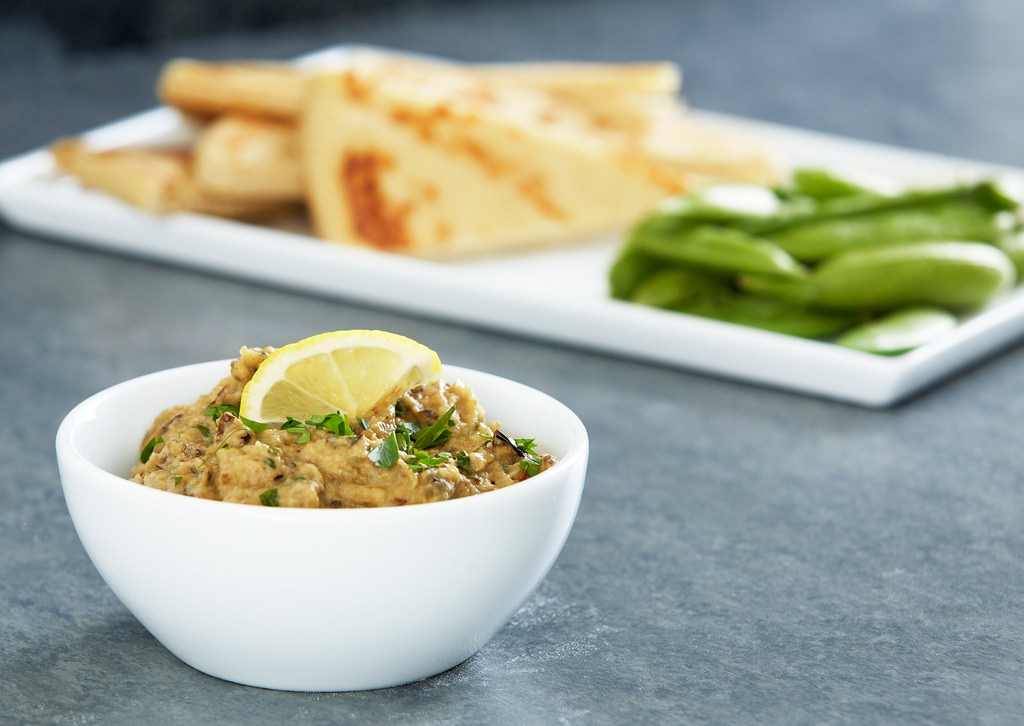 A Middle Eastern (originally Lebanese) dish of puréed roasted aubergine, garlic, and tahini.