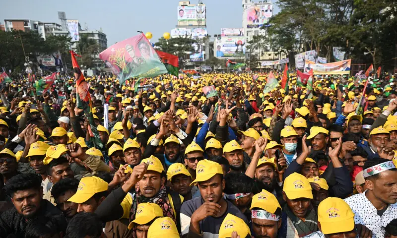 Tens of thousands of flag-waving supporters of key frontrunner Tarique Rahman of the Bangladesh Nationalist Party (BNP) crowded the streets of the northern city of Sylhet, chanting his name.