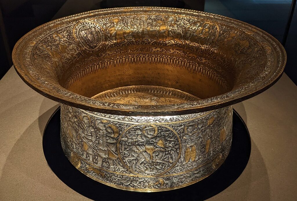 - Bassin Dit « baptistère de Saint Louis ». Vers -1340 1320. Laiton martelé, décor incrusté d’or, d’argent et de pâte noire, H. 22 cm ; D. ouverture 50,2 cm. Louvre. https://www.louvre.fr/oeuvre-notices/bassin-dit-baptistere-de-saint-louis.