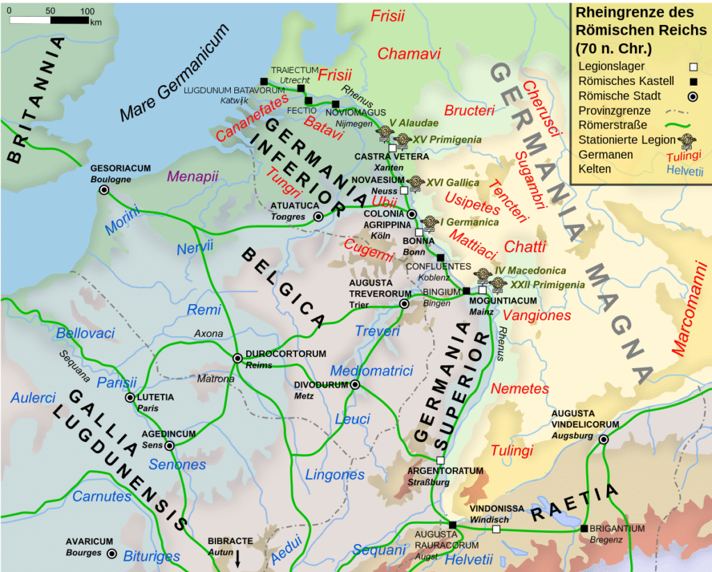In the Late Roman army there was still a unit called Batavi. The name of the Bavarian town of Passau descends from the Roman Batavis, which was named after the Batavi. The town’s name is old as it shows the typical effects of the High German consonant shift (b > p, t > ss).