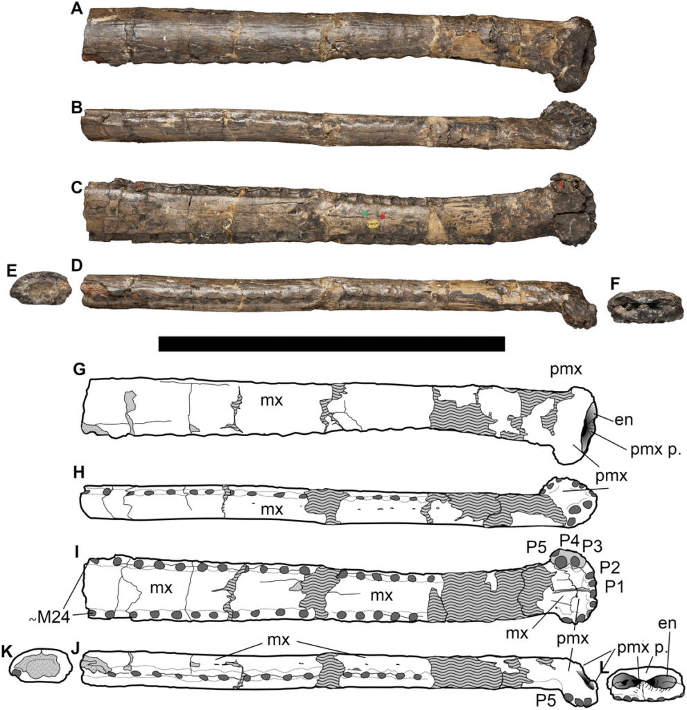 Bathysuchus was originally described as a new species of Teleosaurus, T. megarhinus, by John Whitaker Hulke in 1871 on the basis of NHMUK PV OR 43086, an incomplete snout from the Kimmeridge Clay Formation of Kimmeridge Bay in Dorset, England.[3] In his 1888 catalog of extinct reptiles and amphibians preserved in the Natural History Museum, Richard Lydekker referred it to Steneosaurus, as S. megarhinus.[4] Delair (1958) did not accept the attribution of T. megarhinus to Steneosaurus,[5] and a 2005 cladistic recovered the species as closer to Teleosaurus than to other species traditionally assigned to Steneosaurus.[6] A preliminary report from 2015 indicated that “Steneosaurus” megarhinus is distinct from all other Middle-Late Jurassic teleosaurids and deserved its own genus.[1] This study was followed up in 2019 by a re-description of all the specimens attributed to the species, which were assigned to a new distinct genus, Bathysuchus megarhinus.[2]