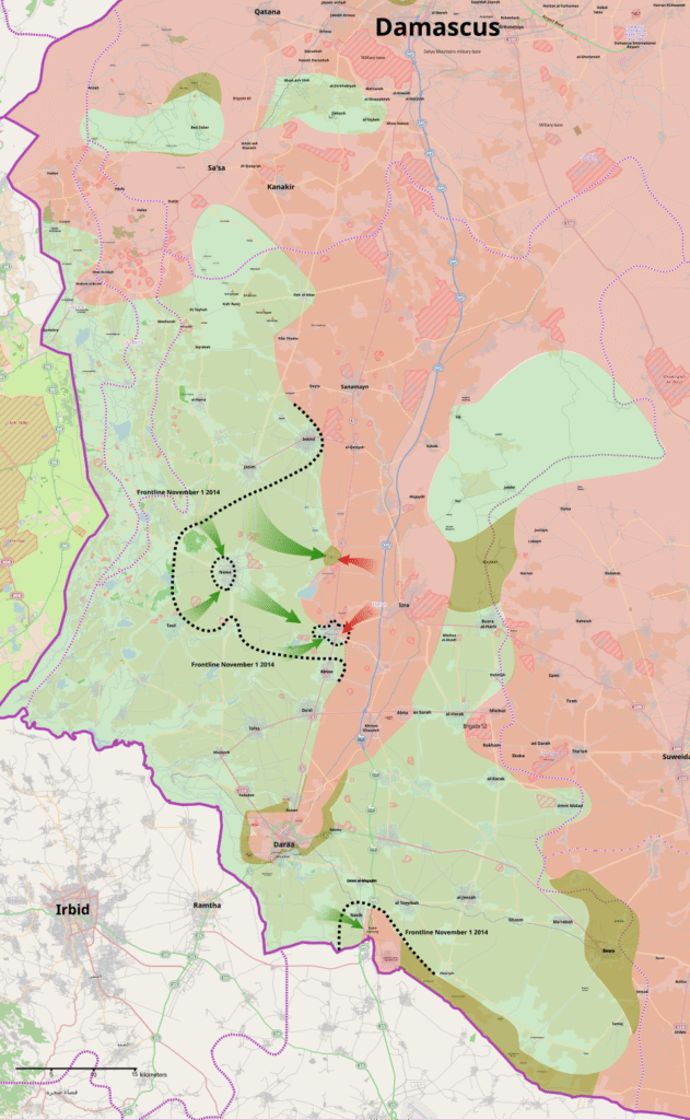 On 25 November, a military source reported that the 12th Brigade of the 5th Division of the Syrian Army had re-established their supply route in the strategic town of Sheikh Miskeen after recapturing the Nawa-al-Dawaar road. The source also claimed that a large number of Al-Nusra fighters, including the leader of “Kateeb Ansar Al-Shariah” (Nusra offshoot) Sami Al-Safadi and 16 others were killed in the area and that three T-55 tanks, taken from the Army in Nawa, were destroyed. On the same day, the same military source claimed that the 175th Brigade was on the outskirts of Nawa, where it looked to breach “Jabhat Al-Nusra” defenses and recapture the surrounding hills overlooking this large city in the Daraa province.[13] However, opposition news agent SLN News claimed that the rebels repelled the army attack from the eastern district of Shaykh Maskin, leaving “scores” of pro-government fighters dead.[39]