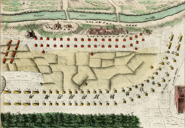 Traun drew up his 11,000-strong army with infantry in the center and cavalry on the wings, parallel to the Spanish lines. He placed the Sardinian cavalry on his left flank under Ferdinand Charles, comte d’Aspremont-Lynden. However, being slightly outnumbered, Traun chose to gamble with an un-orthodox strategy. Instead of aligning his soldiers directly opposite the Spanish line, he shifted his troops to the northeast. This placed Traun’s infantry center opposite the gap between Gages’ infantry center and his right wing of cavalry. This meant that Traun would have a greater superiority of numbers on his left wing so he could deliver a flank attack on the Spanish right. The disadvantage was that Traun’s own right flank would be vulnerable to an attack by the Spanish left flank. Traun hoped the troops of his right wing could delay the Spanish left wing long enough for the action on his other wing to be decisive.
