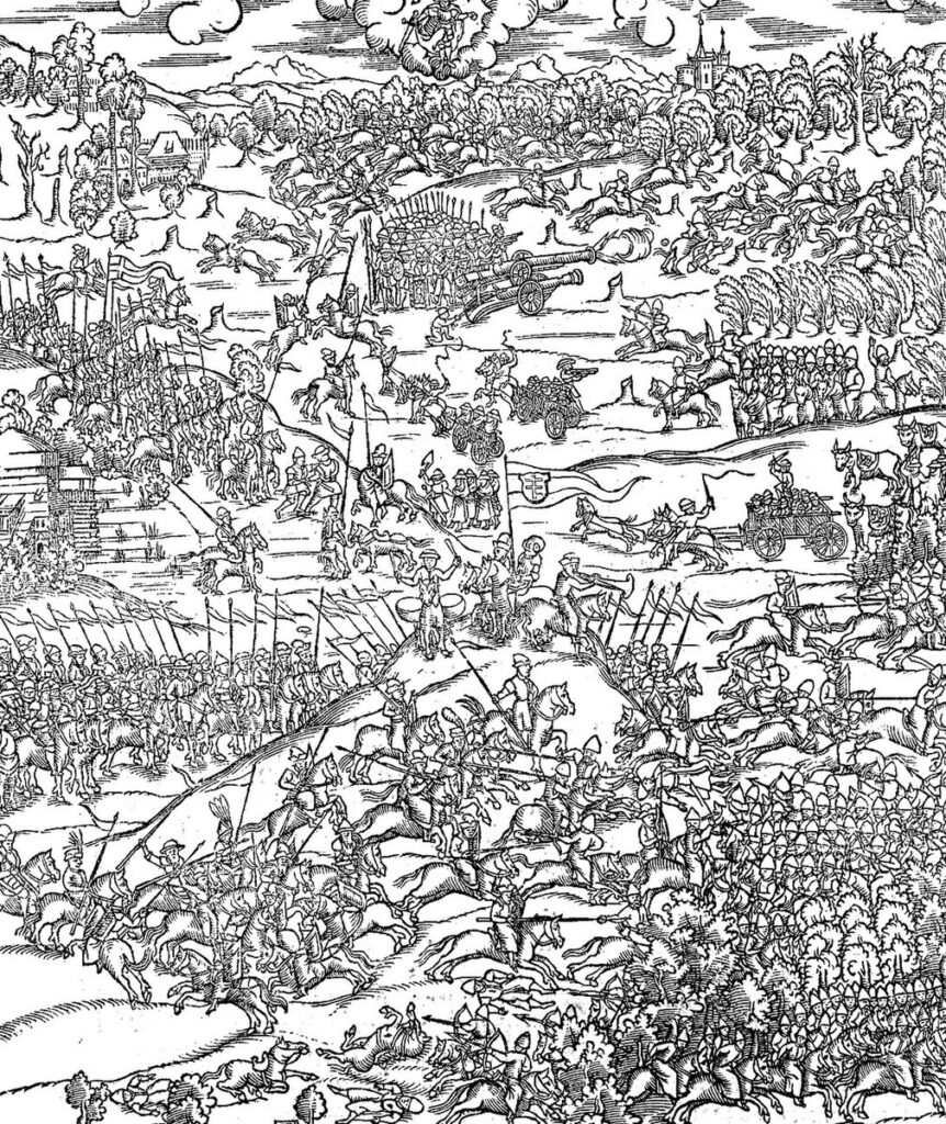 However, Glinski’s political rival Jan Zabrzeziński did not trust Glinski’s command and, against orders, attacked the Tatars as soon as one of the bridges was completed on 5 August. The small detachments of Zabrzeziński’s men were quickly defeated, and the Tatars mockingly displayed their severed heads. This enraged the right wing of the Lithuanian army, which promptly attacked in full force. That prompted the Tatars to concentrate their full force against the Lithuanian right wing, leaving only weak defenses against the Lithuanian left wing, which delayed its attack. When Glinski led the left wing forward to the assault, the Lithuanians easily broke through the defenses and attacked the main Tatar forces from the rear. The Tatar army was split in half: one half was surrounded and defeated while the other retreated. The Lithuanians then pursued the retreating part of the Tatars army; it was said that more Tatars died retreating across the Tsapra than in the battle.