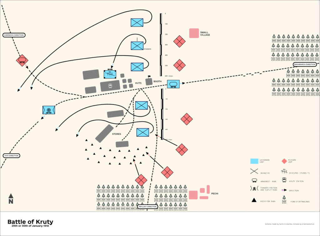 The battle involved a numerically inferior force composed of military cadets and parts of the Ukrainian People’s Army, which managed to postpone the Bolshevik advance on Kyiv at the cost of huge losses in its own ranks. This allowed the Ukrainian delegation to win time at the peace negotiations in Brest. The battle became a moral symbol of sacrifice brought by Ukrainian youth in defence of their country.[4]
