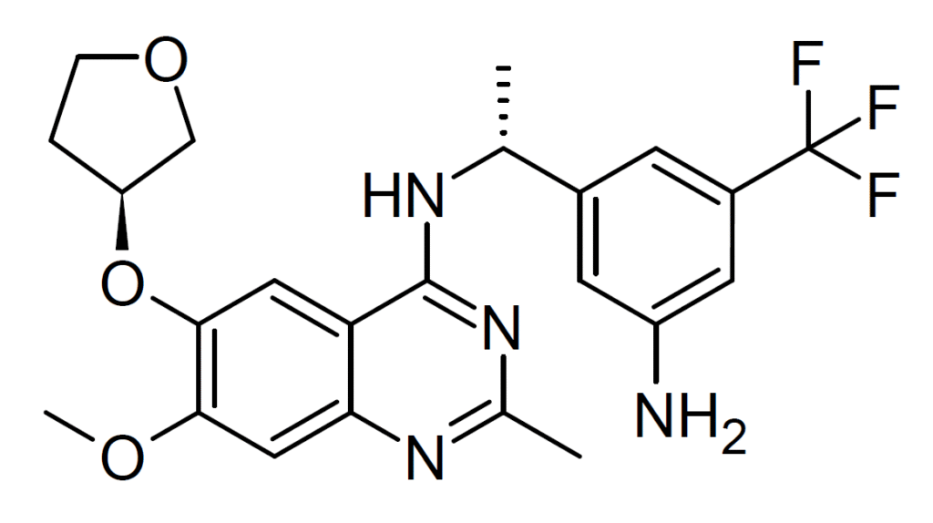 BI-3406 is a drug that acts as an inhibitor of the guanine nucleotide exchange factor protein SOS1, and prevents it from binding to its target protein KRAS. It has potential applications in the treatment of cancer, and has been widely used in cancer research either in combination with other drugs or as a lead compound for the development of related compounds.[1][2][3][4][5][6][7]