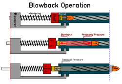 In firearms, a blowback system is generally defined as an operating system in which energy to operate the firearm’s various mechanisms, and automate the loading of another cartridge, is derived from the inertia of the spent cartridge case being pushed out the rear of the chamber by rapidly expanding gases produced by a burning propellant, typically gunpowder.[3] When a projectile (e.g. bullet) is still within the gun barrel, the high-pressure propellant gas behind it is contained within what could be seen as a closed system, but at the moment it exits the muzzle, this functional seal is broken, allowing the propellant gas to be suddenly released in an explosive muzzle blast. The expanding gas also creates a jet propulsion effect rearward in the barrel against the spent cartridge case. This “blowback” is the predominant component of the recoil.[3] Some guns use energy from blowback to perform the automatic bolt cycling /reloading process, while others will use a portion of the blowback to operate only certain parts of the cycle or simply use the blowback energy to enhance the operational energy from another system of automatic operation.[3]