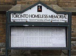 - ^ “‘Unconscionable injustice’: Unprecedented number of names added to toronto homeless memorial in December”. The City Centre Mirror. 13 December 2021. ProQuest 2610184106.