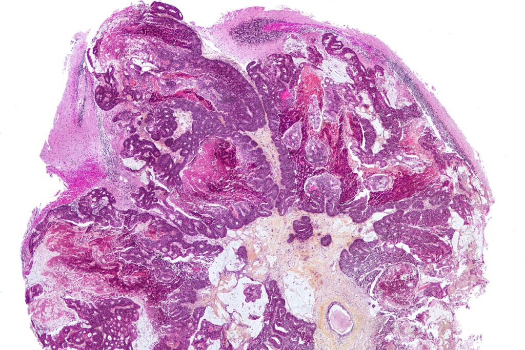 Micrograph showing a colorectal carcinoma metastasis to the cerebellum. HPS stain.