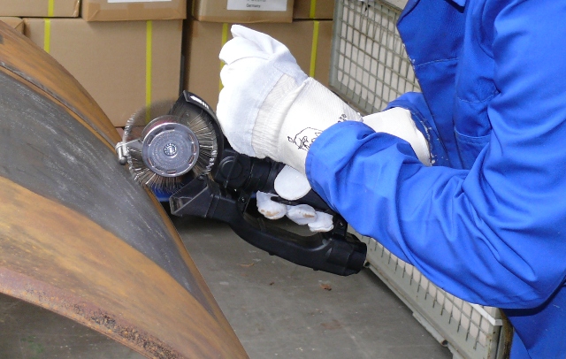 Bristle blasting tools are fabricated from high-carbon steel wires that protrude through a flexible circular belt. The belt, in turn, is attached to a rotating hub, which is powered by an electric or pneumatically driven spindle. The tool is lightweight, portable, and easily implemented by workers without the need for elaborate set-up or sophisticated safety apparatus.[4]