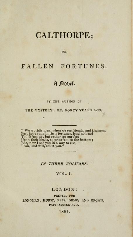Calthorpe, or Fallen Fortunes is an 1821 novel by the British writer Thomas Gaspey. It was published in three volumes by the London firm Longman, Hurst, Rees and Orme. Partly set in Germany amongst British merchants, it contains a murder mystery.[1] The negative portrayal of banks and financiers is a recurring theme in British literature of the era.[2]