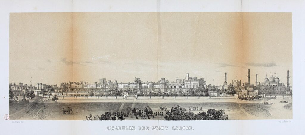 As Afghan forces approached, Lahna Singh, the Sikh administrator of Lahore, allowed many residents of Lahore and nearby Shahdara to withdraw to safer places. He summoned leading Muslim notables of the city, including Mian Chiragh-ud-din Shah Sultanpuri, Mir Ghalib Shah and Mian Muhammad Ashiq, and handed over the civic authority to them, assuring that the fort and city would be left intact. He requested that they intercede with Shah Zaman to secure lenient treatment for the population before withdrawing with a small escort towards the fort of Haji Saeed Khan.[3] On 31 December 1796, Sher Muhammad Khan Wazir entered Lahore at the head of about 12,000.[3] The Muslim leaders of the city delivered the keys of the Lahore Fort to him, and proclamations were issued on behalf of Shah Zaman forbidding his troops to commit outrages against the inhabitants. Afghan officers wishing to reside inside the city were ordered to rent houses with the consent of their owners, and the reopening of shops followed the assurances of protection for life and property.[3] Shah Zaman himself entered Lahore on 1st January 1797 and was ceremonially welcomed by the inhabitants, who greeted him with showers of silver flowers. Contemporary accounts describe him as a twenty-six-year-old warrior, wearing a black sheepskin cap and issuing brief, strict orders that made a strong impression on the citizens. He held court in the Diwan-i-Khas, heard reports of about 5,000 Sikh fighters assembled near Amritsar, and addressed letters to the Sikh chiefs summoning them to his presence. The Raja of Patiala, Sahib Singh, sent a written submission expressing his obedience and willingness to attend the Afghan ruler wherever ordered.[3] Seated on a movable throne, Shah Zaman inspected the defences of Lahore and ordered repairs to several parts of the fort complex, including his sleeping chamber, the prayer room, the Saman Burj and the Naulakha pavilion. He stationed selected Durrani troops in the Shalimar Gardens and issued strict orders that no one should oppress the people of Lahore, threatening severe punishments. Some Afghan soldiers accused of abuses reportedly had their noses cut off and were paraded publicly as an example.[4] Despite these measures, the situation in the city remained tense. When it was reported that Hindu and Muslim shopkeepers had failed to illuminate their houses and shops in celebration, Shah Zaman imposed a poll tax. Although Muslims were later exempted after petitions, the tax was collected repeatedly from Hindu households, with Afghan soldiers stationed at their doors and using force to extract payments. The levy caused hardship and led to distress and even suicides among some inhabitants, while the Afghan ruler distributed robes of honour to local headmen and struck coins in his own name after the tax had been realised.[4]