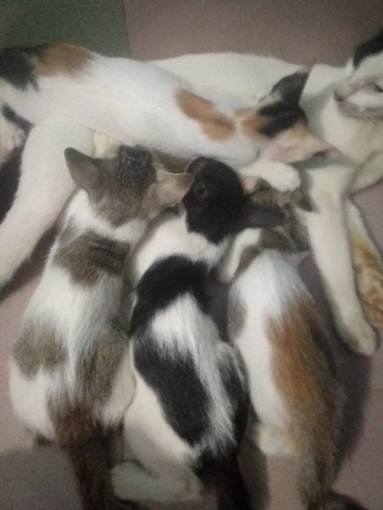 Kittens “knead” the breast while suckling, using the forelimbs one at a time in an alternating pattern to push against the mammary glands to stimulate lactation in the mother.