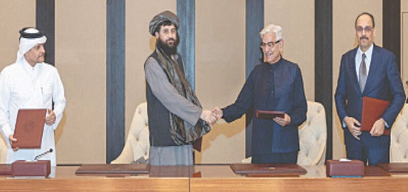 Business, games, Health, Home, pakistan, PoliticsTurkiye, Qatar help seal truce on western front October 20, 2025 DEFENCE Minister Khawaja Asif shakes hands with his Afghan counterpart Mullah Yaqoob, following the signing of a ceasefire agreement in