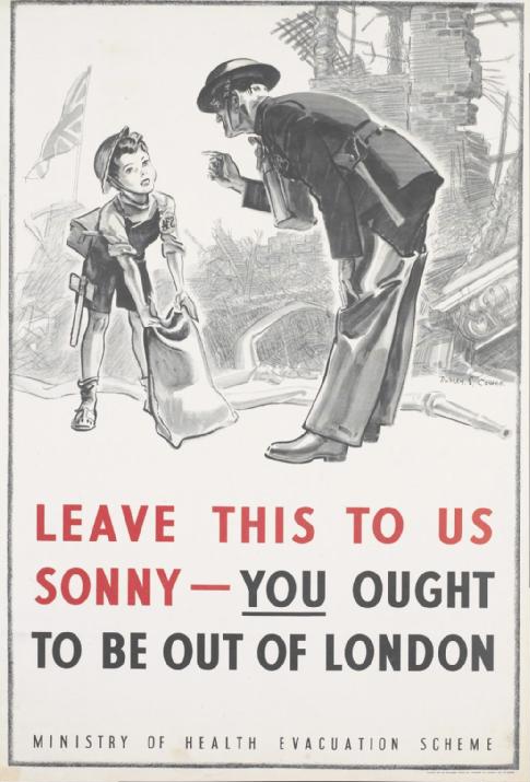 Movement of civilians away from aerial bombardment in British cities in the 1940s Poster by the Ministry of Health promoting