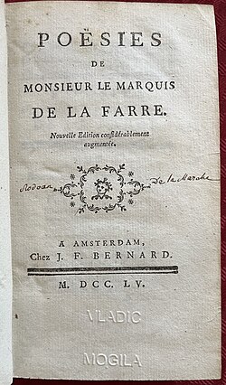 La Fare’s poetry reflected his lifestyle. His verses praised the charms of rest and pleasure and were, according to the author, composed only for pleasure and without purpose.