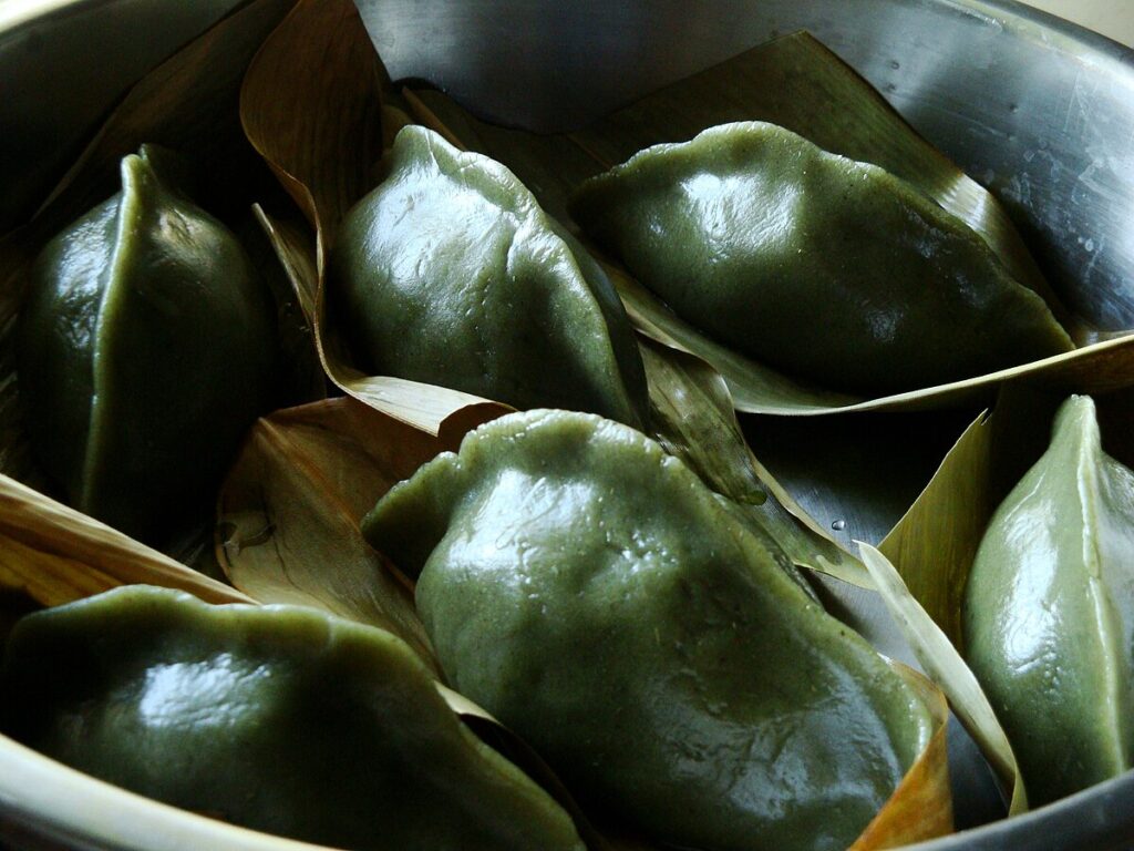 Glutinous rice dumplings colored green with herbs