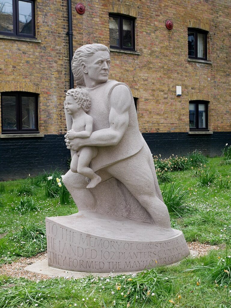 The rector at St Mary’s from 1611 to 1654 was Thomas Gataker, a Puritan, and Captain Jones may have learned Puritanism from him and could be the reason he accepted the risky task of transporting religious separatists to the New World. Also living in Rotherhithe after 1611 were Mayflower part-owners John Moore and First Mate John Clarke, after whom Clarke’s Island in Plymouth Bay, Massachusetts is named. Clarke had been baptized in St. Mary’s in 1575 and spent five years, from 1611 to 1616 as a prisoner of Spain.