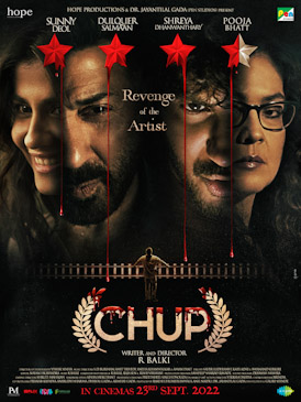 Chup: Revenge of the Artist is a 2022 Indian Hindi-language crime thriller film written and directed by R. Balki.[5] The film stars Sunny Deol, Dulquer Salmaan, Shreya Dhanwanthary, and Pooja Bhatt.[6] Set in Mumbai, the film focuses on a serial killer targeting corrupt film critics and a police officer assigned to catch the killer. Chup was released on 23 September 2022 to mixed reviews from critics.[7][8]