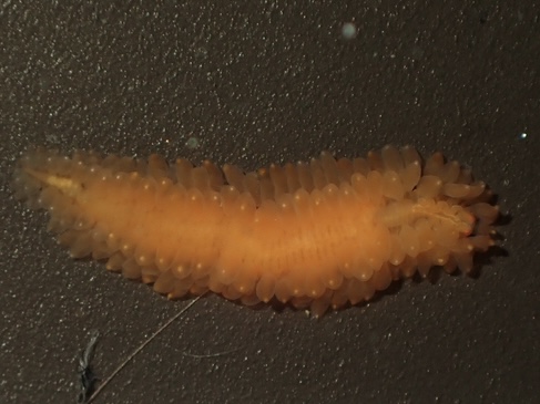 The species is vermiform (worm-shaped), with a strongly arched body that tapers posteriorly. It measures approximately 29 mm in length and 2.5 mm in width, with about 130 segments. In life, the body and cirri are orange-yellow, with red eyes. The prostomium is rounded with two pairs of large, black, oval eyes. It has three short, smooth tentacles of equal length. Distinctive features include two prominent, sinuous nuchal epaulettes, large ovoid dorsal and tentacular cirri, and compound setae with bidentate end pieces. The dorsal cirri alternate in position on the body wall, with smaller cirri inserted more dorsally and larger ones inserted more laterally. The parapodia have a prominent dorsal lobe.[2]