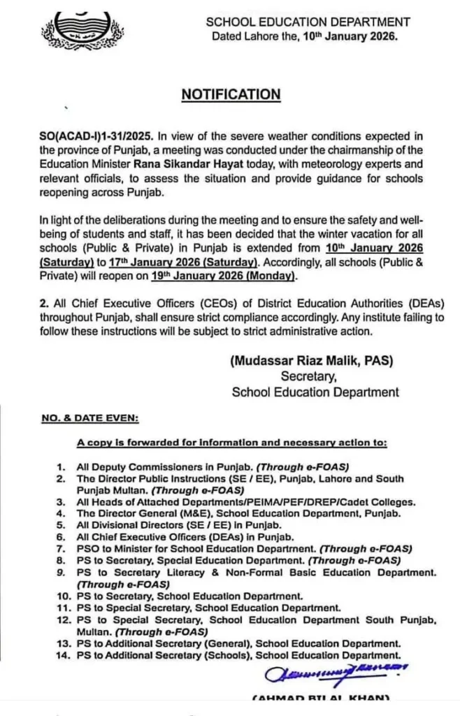 Punjab Education Minister Rana Sikandar Hayat on Saturday announced that the government decided to extend winter vacations in all public and private schools across the province till January 19, citing the extremely low temperatures expected in the coming days.