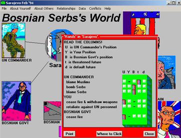 Screenshot illustrating the use of confrontation analysis Version 1 in a role play written by Professor Nigel Howard in a computer-aided role play depicting the Siege of Sarajevo
