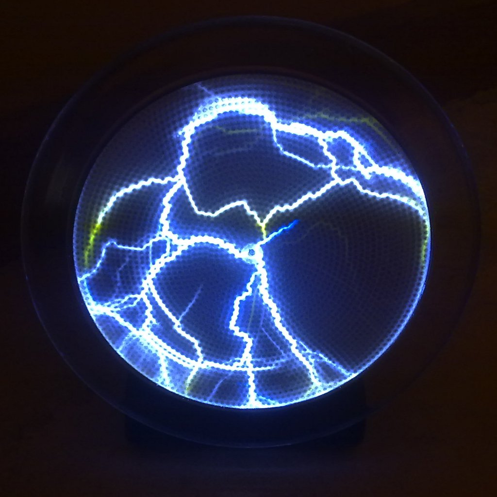 A crackle tube is a type of plasma lamp that is used most commonly in museums, night clubs, movie sets, and other applications where its appearance may be appealing for entertainment. Such a device consists of a double walled glass tube with a hollow center. The cavity between the inner and outer glass tubes is filled with thousands of small phosphor coated glass beads. A 5–14 kV transformer produces a low power gas discharge in the bead filled cavity, producing filaments of light that simulate lightning. Crackle tubes get their name not because of the sound they produce but rather because of the appearance of their internal behavior. The “lightning” (filaments or streamers) is forced around and in between the phosphor-coated glass beads, due to the beads’ dielectric nature. In so doing, the phosphor is excited by the electrical energy and fluoresces producing visible light. Like plasma globes, crackle tubes respond to touch; the filaments appear to be “attracted” toward the point of contact and usually become more luminous (brighter) as the electricity is grounded. The tubes are also filled with a noble gas like neon, argon, or xenon which acts as the electron transfer medium of the cavity. The gas is typically below atmospheric pressure.
