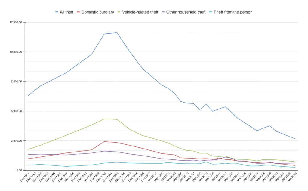 Chart showing total theft as well as domestic, vehicle, houshold and personal theft declining over the period 1981 to 2023