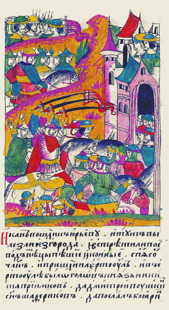 The sack of Novgorod by Ivan IV‘s oprichniki contributed to the crisis in the north-west. As part of his attack Ivan burned the fields, laying waste roughly 90 percent of the arable land surrounding Novgorod. Coupled with the crop failures of the years before, this would create a massive food shortage (and cause supply problems for Russia in the Livonian war).[7] Both nobles and common people were put to death and the frequent changes of land ownership impacted the economy negatively. A contemporary chronicler from Pskov wrote “The Tsar instituted oprichnina and from thence the great desolation of the Russian land.”