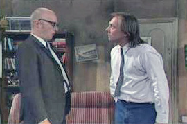 This episode begins with the pair doing a crossword. They get bored of creating made-up words for the clues, which leads to Richie telling Eddie to “do it properly or not at all” so he tears up the paper. They then argue about whose fault it is that the television has been repossessed. Richie said that Eddie went to Rumbelows with the money to pay the rent they had fallen behind on, but instead gave it to a strange and wizened old man in return for five magic beans (which are all just worthless dead seeds). Eddie responds that they were £86.23 behind with the rental because Richie was bypassing Rumbelows as he’d saved up the rent money every week for the past three months, but instead he took it “five doors along to Dr. O’Grady’s personal organ enhancement clinic”, and lost a mere £85 to have his personal organ enhanced “so that it is comparable in size to that of a fully-grown mountain gorilla.” (which turned out to be a scam, as Dr. O’Grady only just stick Richie “in a cubicle for half an hour with a copy of Razzle“). Shortly the duo relent and start feeling sorry for themselves and trying alternative ways to entertain each other without the TV, while missing their favorite programs.