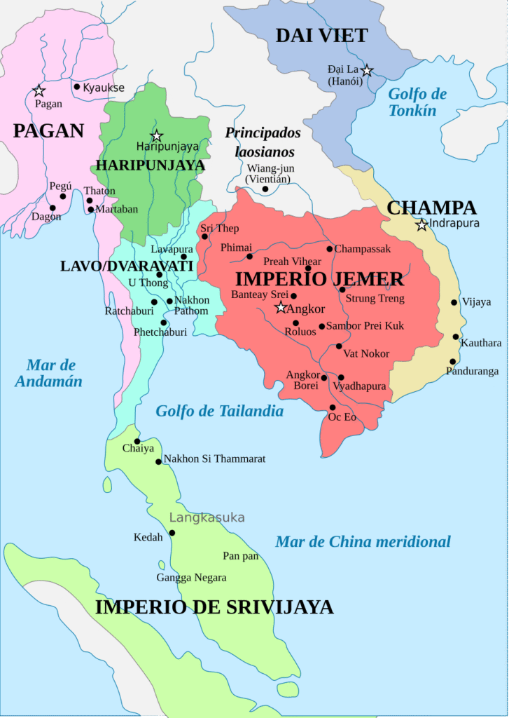 After a failed attempt to seize seaports in southern Đại Việt, Suryavarman turned to invade Champa in 1145 and sacked Vijaya, ending the reign of Jaya Indravarman III and destroying the temples at Mỹ Sơn.[1][2] Inscriptional evidence suggests that Suryavarman II died between 1145 AD and 1150 AD, possibly during a military campaign against Champa. He was succeeded by Dharanindravarman II, a cousin, son of the brother of the king’s mother. A period of weak rule and feuding began.