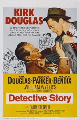 Detective Story is a 1951 American crime drama film noir directed by William Wyler and starring Kirk Douglas that tells the story of one day in the lives of the various people who populate a police detective squad. The ensemble supporting cast features Eleanor Parker, William Bendix, Cathy O’Donnell and George Macready, and Lee Grant and Joseph Wiseman play large roles in their film debuts. The film was adapted by Robert Wyler and Philip Yordan from the 1949 play by Sidney Kingsley. It was nominated for four Academy Awards, including Academy Award for Best Director for Wyler, Best Actress for Parker and Best Supporting Actress for Grant.