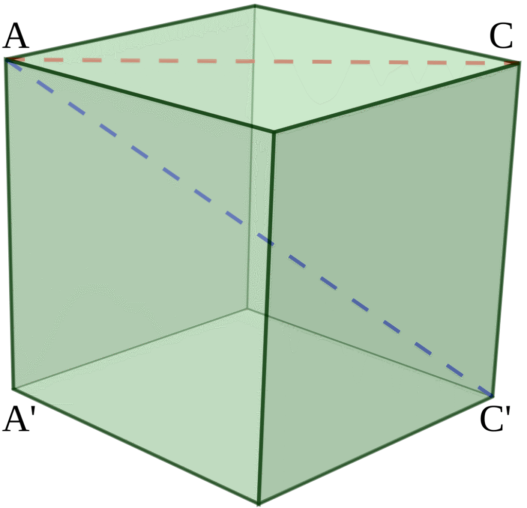 The diagonals of a cube with side length 1. AC’ (shown in blue) is a space diagonal with length , while AC (shown in red) is a face diagonal and has length .