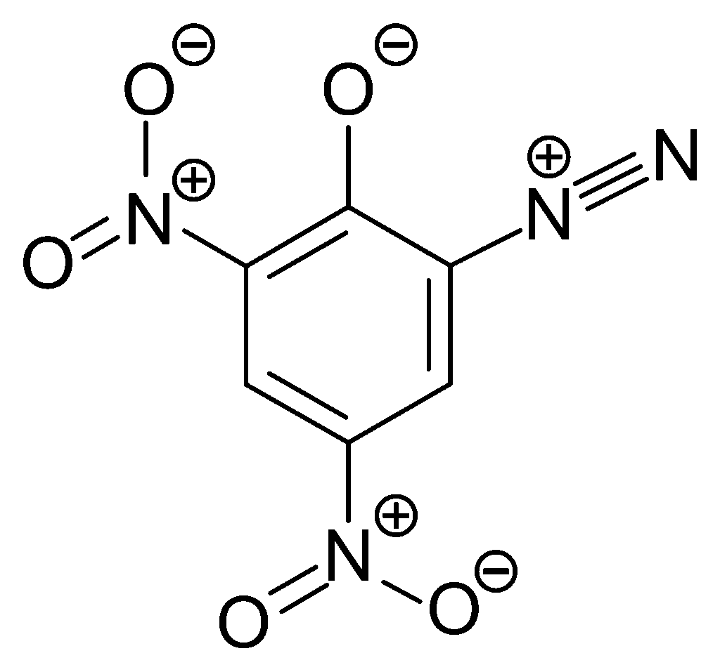 Diazodinitrophenol (DDNP) was the first diazo compound produced; it was subsequently used to make dyes and explosives. It forms yellow crystals in pure form; however, the color of impure forms may vary from dark yellow to green to dark brown.[1] It is soluble in acetic acid, acetone, concentrated hydrochloric acid, like most non-polar solvents and is slightly soluble in water.[2]