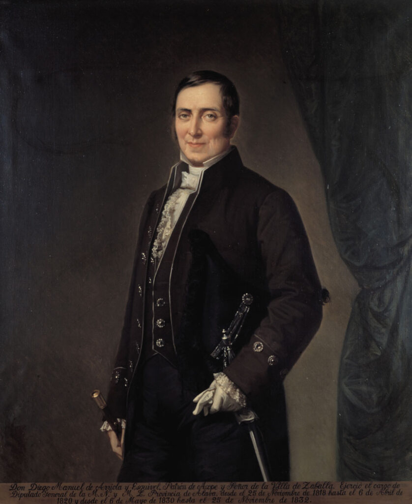 A native of Vitoria, he was born in the capital of Álava in 1784.[2][3] He was born into a landowning family, with the right to inherit up to eight entailed estates spread throughout the Basque provinces.[3][2] A moderate liberal, he was elected mayor of Vitoria three times: in 1811, 1813, and 1815. A few years later, during the three-year period of 1818–1820, he also served as the General Deputy of Álava , a position he would hold again from 1830 to 1832.Afterwards, Íñigo Ortés de Velasco , from the same position he had held, entrusted him with the post of lieutenant, in which he would experience the First Carlist War. He had already served as lieutenant in 1829. From both positions, he was one of the proponents of having a new headquarters for the institution, which would lead to the construction of the palace in which it is still housed today .