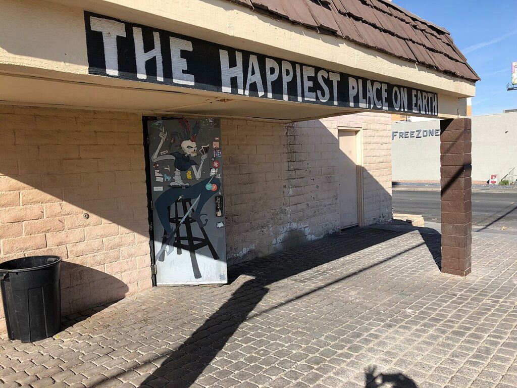 The interior is an energetic collage of neon art, hand-painted signs, and layers of stickers and memorabilia, contributing to what Nevada Public Radio called “a study in chaos art.” The bar also features a renowned jukebox, praised for its eclectic blend of local punk bands and Las Vegas standards.[2] The televisions above the bar are typically tuned to a continuous reel of obscure and campy B-movie clips, curated to amplify what Moss has described as the bar’s vibe of “shock and oddity.”[5] Even the bathrooms—intentionally left in a state of perpetual disrepair after earlier renovation attempts were vandalized—have become part of the bar’s lore.[1] The Times of India once advised travelers to “Avoid the restroom at all costs.”[11]