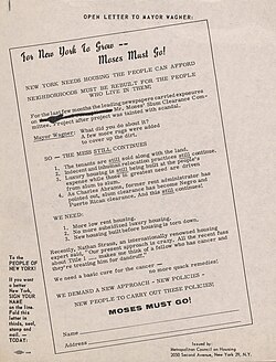 One group formed in the crisis of the housing shortage would be the Metropolitan Council on Housing in 1959, who would actively rally against the razing done by the New City Administration.[1]: Chapter 3